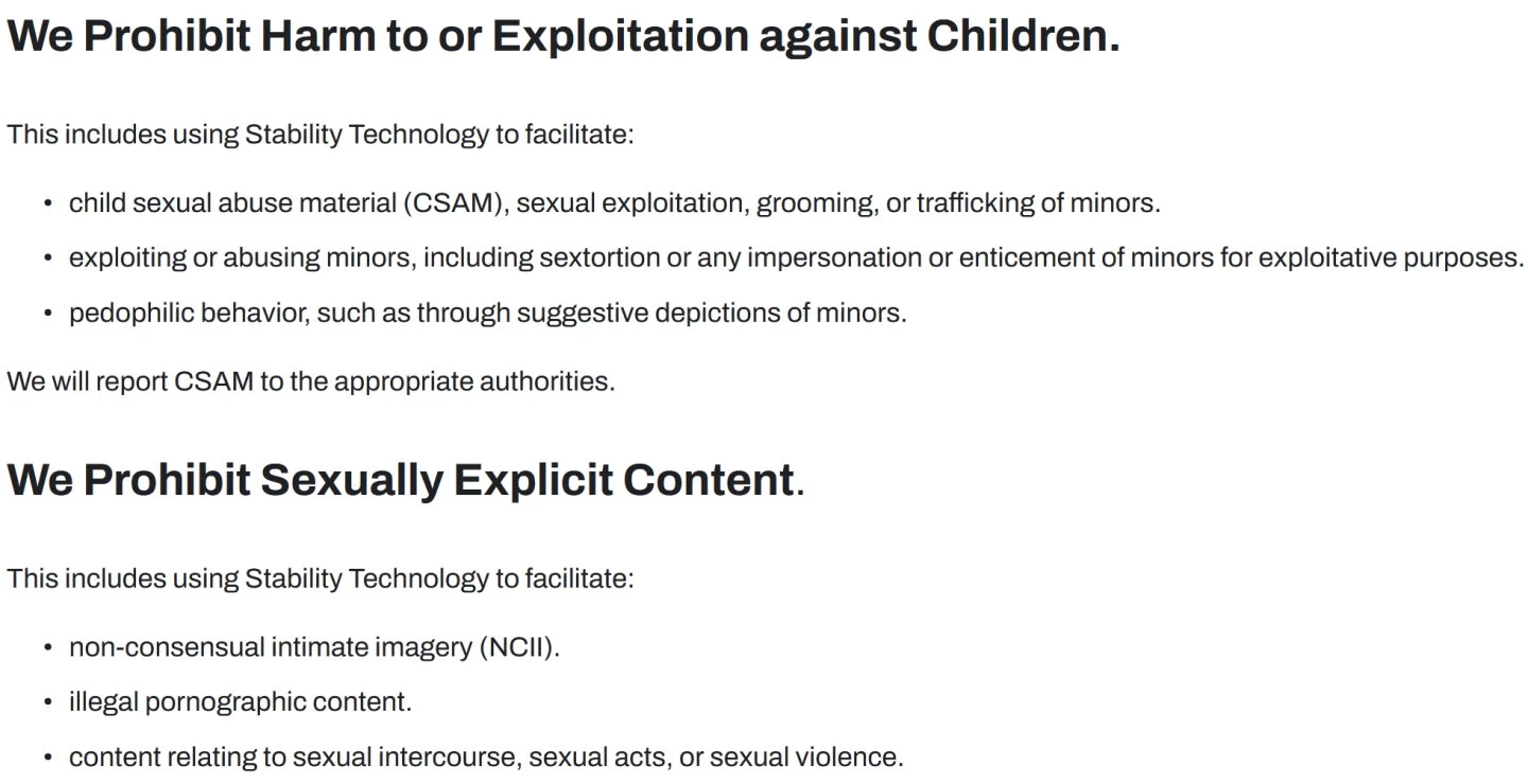 Stability AI在其官方網站「可接受使用條款」(Acceptable Use Policy)頁面公布的更新版本中,明確列出了禁止的內容類型和使用行為,特別加強了對色情與兒童保護的規範。新版條款要求所有使用者必須年滿18歲,且不得違反法律或侵害他人權利。重點禁止行為包括: