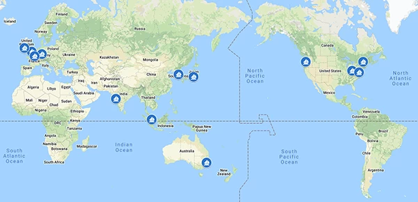 这真是覆盖了全球。我做了一张他们的服务器位置地图,正如你所看到的, ProwHost 的服务器永不落山: