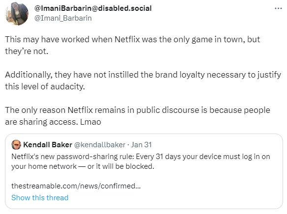 他们的总体思路是阻止人们与朋友和家人共享帐户……并通过对每个从与家庭住址不同的 IP 地址登录的用户每月额外收取 7.99 美元来增加利润。