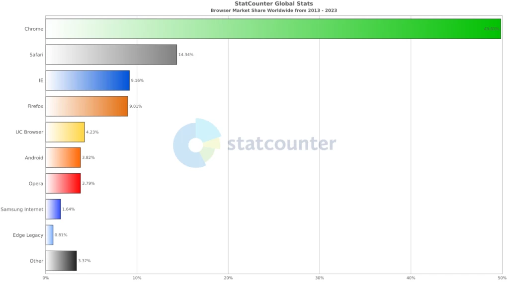 2013 年至 2023 年间,Chrome 浏览器一直占据市场主导地位,市场份额约为 50%,Safari 浏览器位居第二,市场份额约为 14%。