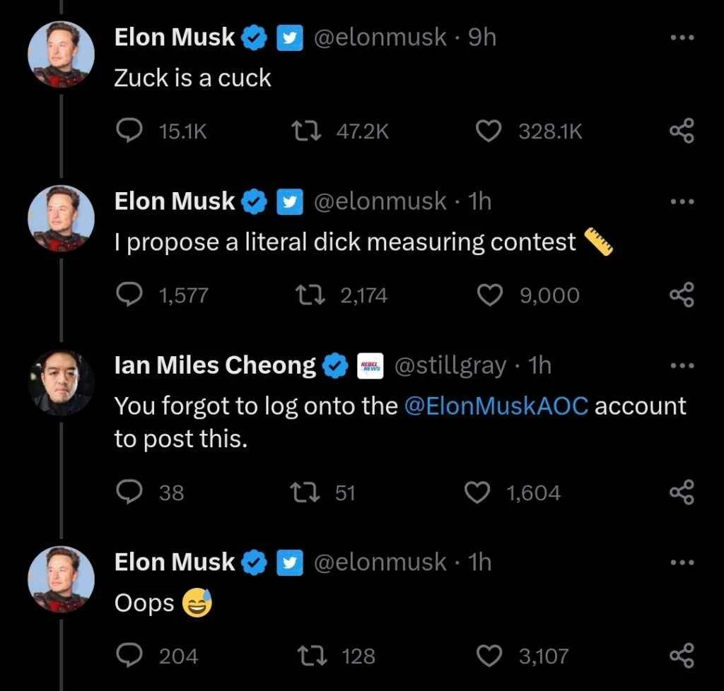 (两个成年人,或者说亿万富翁,在各自的社交媒体网站上互相指责,这种反乌托邦式的滑稽场面……简直就像是2023年才会发生的事情。)
