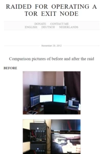 我的托管服务器没有被没收,很可能是因为它们位于欧盟管辖范围之外(列支敦士登、美国、香港)。当然,也不排除它们现在可能已经被监听了。运行出问题的出口节点的服务器位于波兰,自从我更换了网络服务提供商后就被禁用了。只有我的公寓遭到搜查,大约20台电脑(主要是准系统PC、惠普存储微型服务器和瘦客户机)、外置硬盘和U盘、我的主力电脑、游戏机、平板电脑(两台iPad)以及我的手机(三星Galaxy Note和一部HTC PDA)都被没收了。