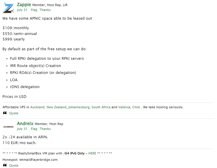 在我们与主机托管相关的论坛 ZHUJIMAO.COM 上,我们有一个专门的讨论帖,用于购买/租赁 IP 空间。