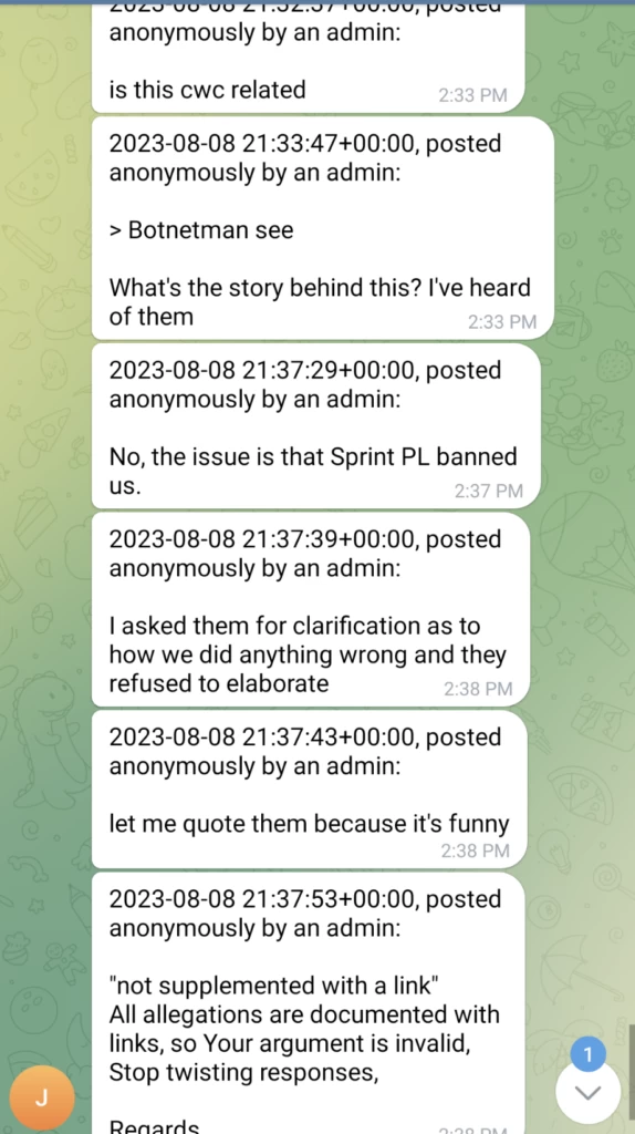 他声称 Sprint 禁止了 Kiwi Farms 的服务,但他又声称 Lolek Hosted 没有在 Sprint PL 上运营,这是不实的。
