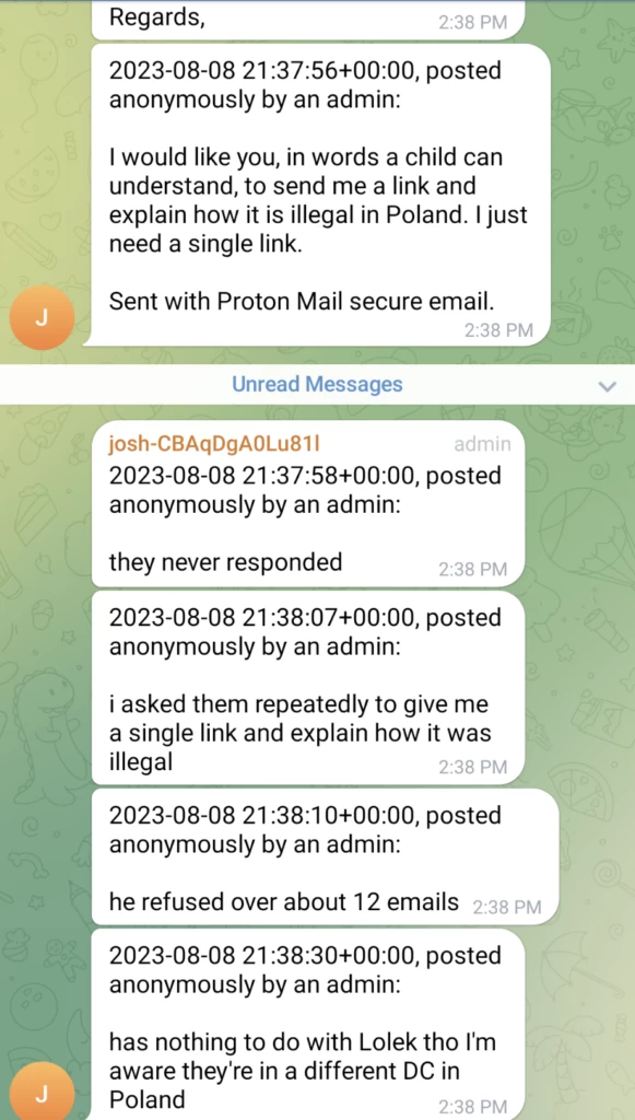 但可以肯定的是,就在 Sprint 数据中心将 Kiwi Farms 踢出其网络前后(据 Kiwi Farms 创始人 Joshua Moon 称),Lolek Hosted 被 FBI 查封了: