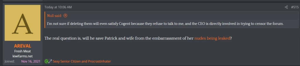 后来,同一名男子的妻子裸照被泄露到 Kiwi Farms 的平台上。