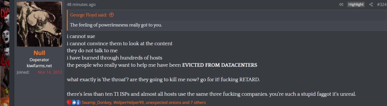 顺便一提,他提到的被“驱逐”出数据中心的那个人是@wdmg 。据我所知,他待了大概6个月,这也是Kiwi Farms的主机商待得最久的一次了。
