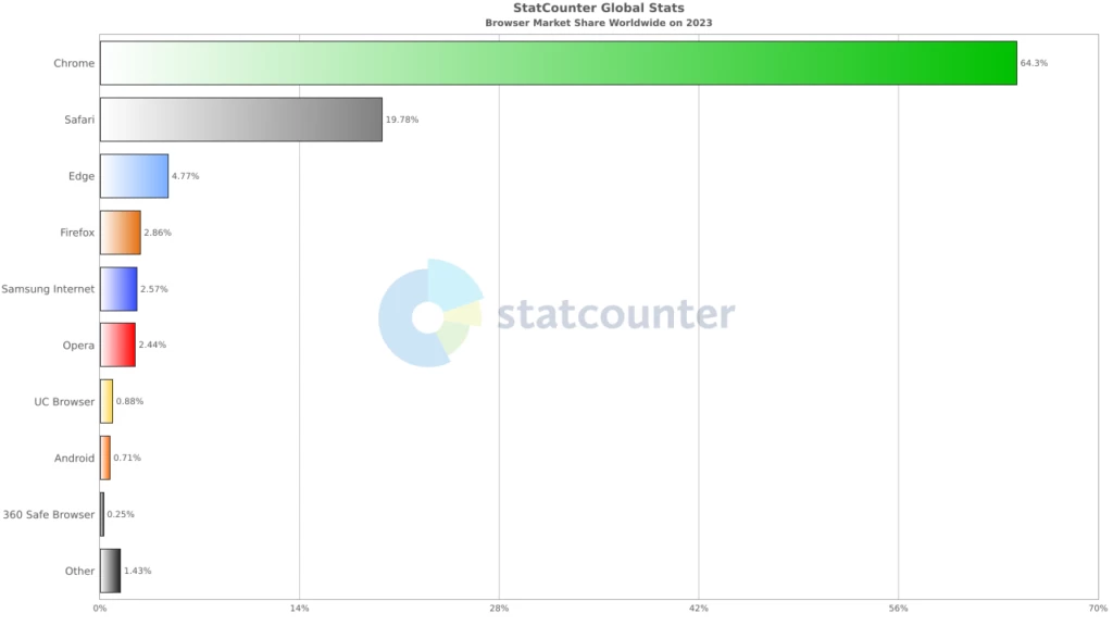 Chrome 目前占据市场主导地位,市场份额约为 64%,Safari 紧随其后,市场份额约为 20%。