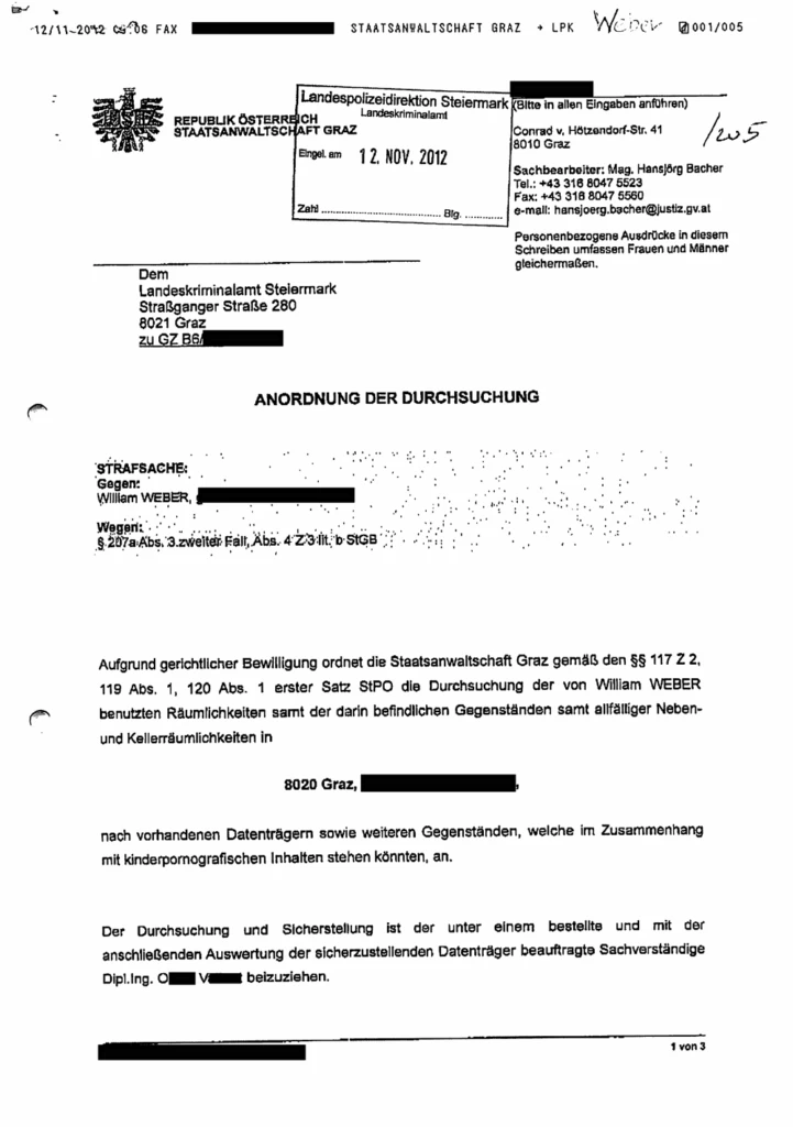 周三上午10点左右(当地时间),奥地利公民威廉·韦伯的公寓遭到施蒂里亚州刑事警察局(LKA)的突击搜查。此次行动是该局对一个利用TOR匿名网络进行儿童色情犯罪团伙调查的一部分。搜查过程中,警方缴获了大量电脑和其他电子设备,以及合法登记的枪支和其他一些物品。威廉很可能被指控传播和制作儿童色情制品。